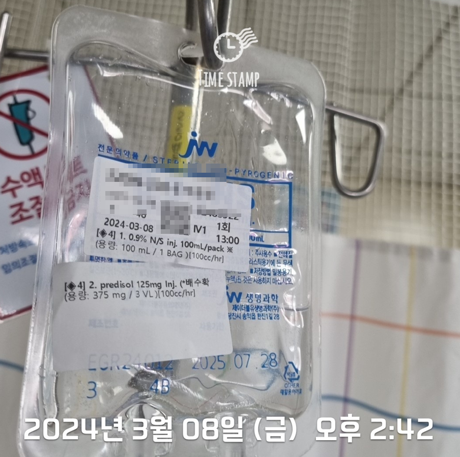 2024.04.05 금~2024.04.07일 오늘이 마지막 치료가 되길. 혈액검사,소변겸사,심전도검사, 엑스레이 찍고 병실이 나지않아 오래 기다렸다. 점심시간 지나 올라와 늦은 식사를 한 후 오후에 스테로이드